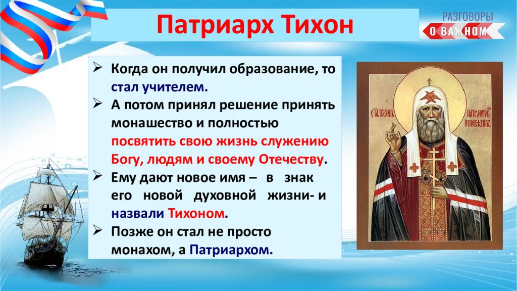 Когда он получил образование, то стал учителем. А потом принял решение принять монашество и полностью посвятить свою жизнь служению Богу, людям и своему Отечеству. Ему дают новое имя – в знак его новой духовной жизни- и назвали Тихоном. Позже он стал не просто монахом, а Патриархом.