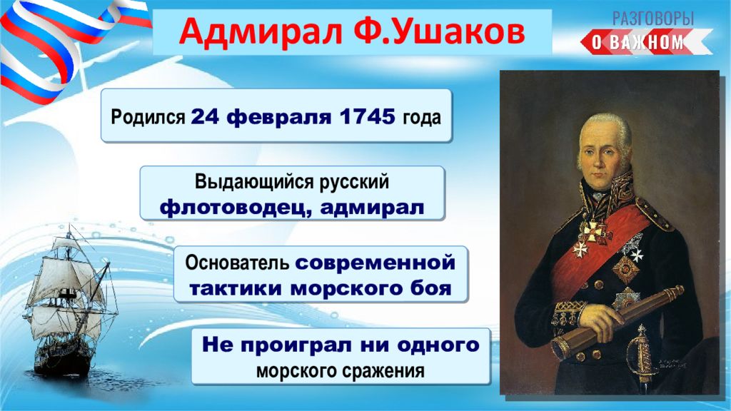 Родился 24 февраля 1745 года Основатель современной тактики морского боя Выдающийся русский флотоводец, адмирал Не проиграл ни одного морского сражения