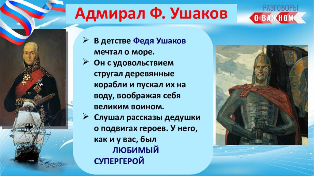 В детстве Федя Ушаков мечтал о море. Он с удовольствием стругал деревянные корабли и пускал их на воду, воображая себя великим воином. Слушал рассказы дедушки о подвигах героев. У него, как и у вас, был ЛЮБИМЫЙ СУПЕРГЕРОЙ