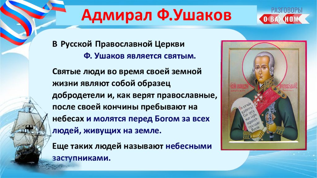 В Русской Православной Церкви Ф. У шаков является святым. Святые люди во время своей земной жизни являют собой образец добродетели и, как верят православные, после своей кончины пребывают на небесах и молятся перед Богом за всех людей, живущих на земле. Еще таких людей называют небесными заступниками. Адмирал Ф.Ушаков