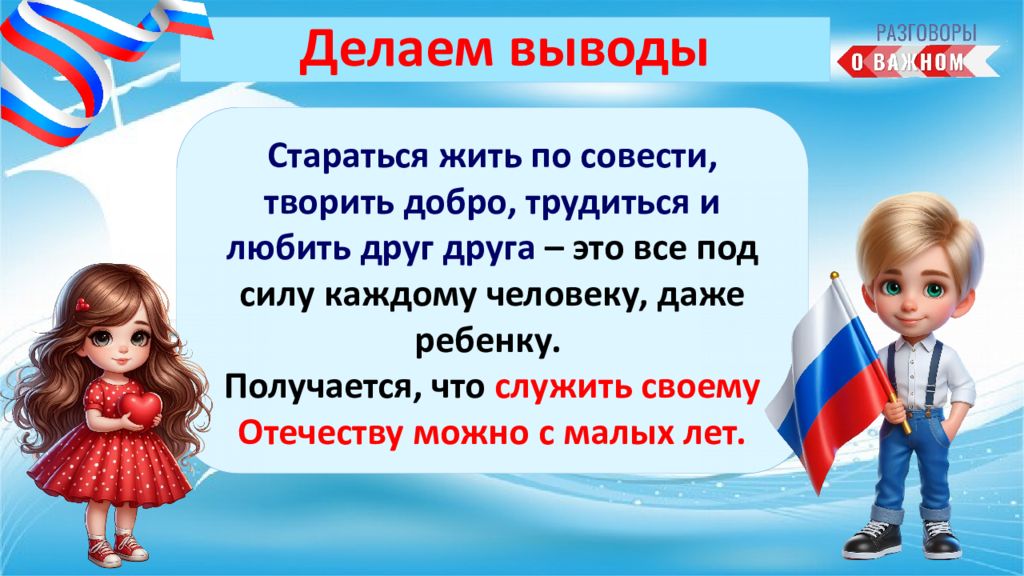 Стараться жить по совести, творить добро, трудиться и любить друг друга – это все под силу каждому человеку, даже ребенку. Получается, что служить своему Отечеству можно с малых лет. Делаем выводы