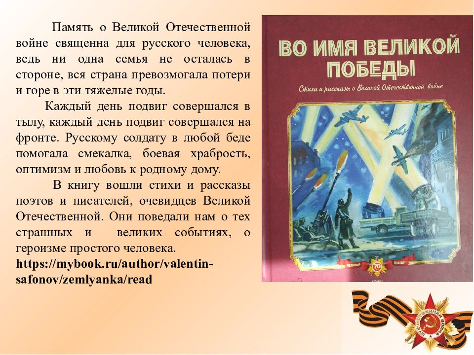 Память о Великой Отечественной войне священна для русского человека, ведь ни одна семья не осталась в стороне, вся страна превозмогала потери и горе в эти тяжелые годы. Каждый день подвиг совершался в тылу, каждый день подвиг совершался на фронте. Русскому солдату в любой беде помогала смекалка, боевая храбрость, оптимизм и любовь к родному дому. В книгу вошли стихи и рассказы поэтов и писателей, очевидцев Великой Отечественной. Они поведали нам о тех страшных и великих событиях, о героизме простого человека. https://mybook.ru/author/valentin-safonov/zemlyanka/read