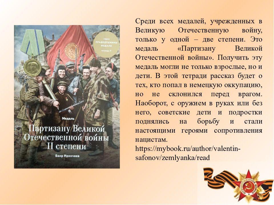 Среди всех медалей, учрежденных в Великую Отечественную войну, только у одной – две степени. Это медаль «Партизану Великой Отечественной войны». Получить эту медаль могли не только взрослые, но и дети. В этой тетради рассказ будет о тех, кто попал в немецкую оккупацию, но не склонился перед врагом. Наоборот, с оружием в руках или без него, советские дети и подростки поднялись на борьбу и стали настоящими героями сопротивления нацистам. https://mybook.ru/author/valentin-safonov/zemlyanka/read