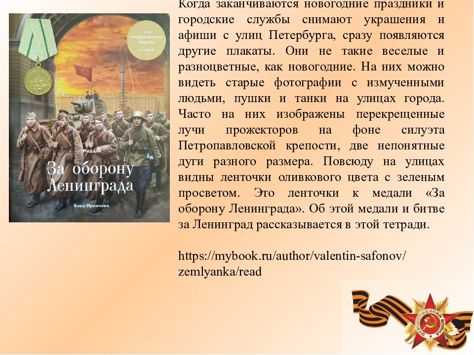Когда заканчиваются новогодние праздники и городские службы снимают украшения и афиши с улиц Петербурга, сразу появляются другие плакаты. Они не такие веселые и разноцветные, как новогодние. На них можно видеть старые фотографии с измученными людьми, пушки и танки на улицах города. Часто на них изображены перекрещенные лучи прожекторов на фоне силуэта Петропавловской крепости, две непонятные дуги разного размера. Повсюду на улицах видны ленточки оливкового цвета с зеленым просветом. Это ленточки к медали «За оборону Ленинграда». Об этой медали и битве за Ленинград рассказывается в этой тетради. https://mybook.ru/author/valentin-safonov/zemlyanka/read