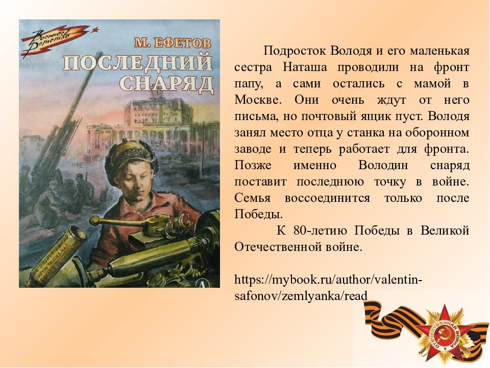 Подросток Володя и его маленькая сестра Наташа проводили на фронт папу, а сами остались с мамой в Москве. Они очень ждут от него письма, но почтовый ящик пуст. Володя занял место отца у станка на оборонном заводе и теперь работает для фронта. Позже именно Володин снаряд поставит последнюю точку в войне. Семья воссоединится только после Победы. К 80-летию Победы в Великой Отечественной войне. https://mybook.ru/author/valentin-safonov/zemlyanka/read