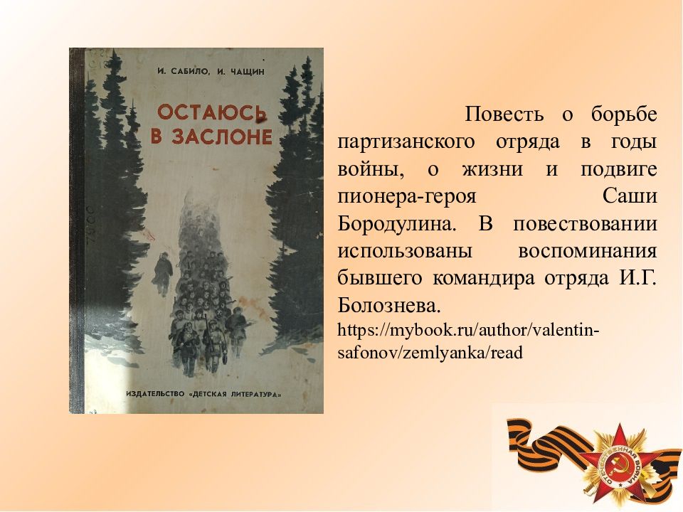 Повесть о борьбе партизанского отряда в годы войны, о жизни и подвиге пионера-героя Саши Бородулина. В повествовании использованы воспоминания бывшего командира отряда И.Г. Болознева. https://mybook.ru/author/valentin-safonov/zemlyanka/read