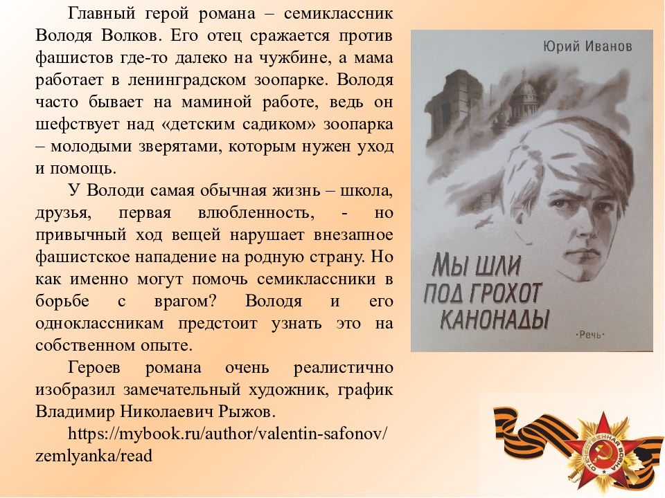 Главный герой романа – семиклассник Володя Волков. Его отец сражается против фашистов где-то далеко на чужбине, а мама работает в ленинградском зоопарке. Володя часто бывает на маминой работе, ведь он шефствует над «детским садиком» зоопарка – молодыми зверятами, которым нужен уход и помощь. У Володи самая обычная жизнь – школа, друзья, первая влюбленность, - но привычный ход вещей нарушает внезапное фашистское нападение на родную страну. Но как именно могут помочь семиклассники в борьбе с врагом? Володя и его одноклассникам предстоит узнать это на собственном опыте. Героев романа очень реалистично изобразил замечательный художник, график Владимир Николаевич Рыжов. https://mybook.ru/author/valentin-safonov/zemlyanka/read