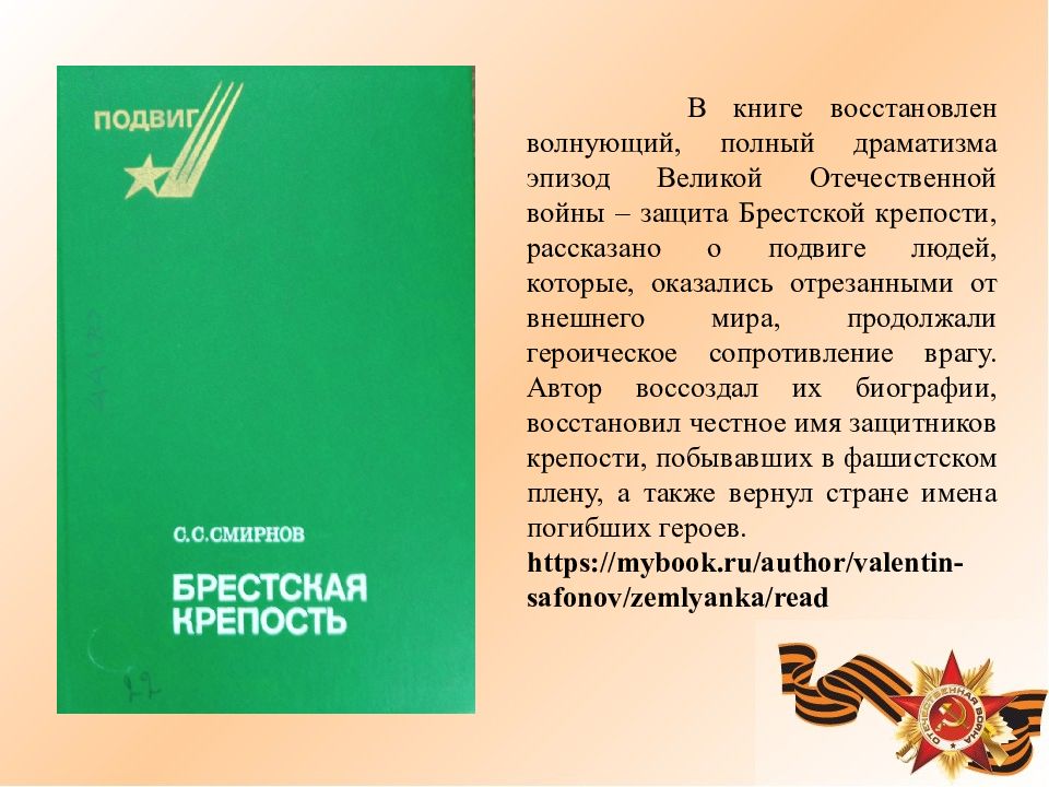 В книге восстановлен волнующий, полный драматизма эпизод Великой Отечественной войны – защита Брестской крепости, рассказано о подвиге людей, которые, оказались отрезанными от внешнего мира, продолжали героическое сопротивление врагу. Автор воссоздал их биографии, восстановил честное имя защитников крепости, побывавших в фашистском плену, а также вернул стране имена погибших героев. https://mybook.ru/author/valentin-safonov/zemlyanka/read