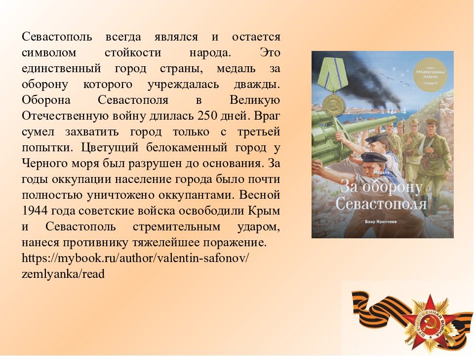 Севастополь всегда являлся и остается символом стойкости народа. Это единственный город страны, медаль за оборону которого учреждалась дважды. Оборона Севастополя в Великую Отечественную войну длилась 250 дней. Враг сумел захватить город только с третьей попытки. Цветущий белокаменный город у Черного моря был разрушен до основания. За годы оккупации население города было почти полностью уничтожено оккупантами. Весной 1944 года советские войска освободили Крым и Севастополь стремительным ударом, нанеся противнику тяжелейшее поражение. https://mybook.ru/author/valentin-safonov/zemlyanka/read