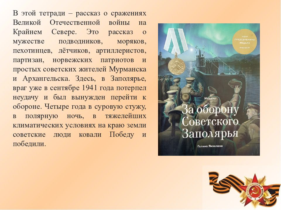 В этой тетради – рассказ о сражениях Великой Отечественной войны на Крайнем Севере. Это рассказ о мужестве подводников, моряков, пехотинцев, лётчиков, артиллеристов, партизан, норвежских патриотов и простых советских жителей Мурманска и Архангельска. Здесь, в Заполярье, враг уже в сентябре 1941 года потерпел неудачу и был вынужден перейти к обороне. Четыре года в суровую стужу, в полярную ночь, в тяжелейших климатических условиях на краю земли советские люди ковали Победу и победили.
