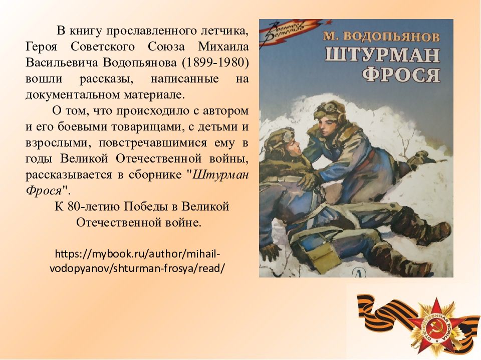 В книгу прославленного летчика, Героя Советского Союза Михаила Васильевича Водопьянова (1899-1980) вошли рассказы, написанные на документальном материале. О том, что происходило с автором и его боевыми товарищами, с детьми и взрослыми, повстречавшимися ему в годы Великой Отечественной войны, рассказывается в сборнике " Штурман Фрося ". К 80-летию Победы в Великой Отечественной войне. https://mybook.ru/author/mihail-vodopyanov/shturman-frosya/read/