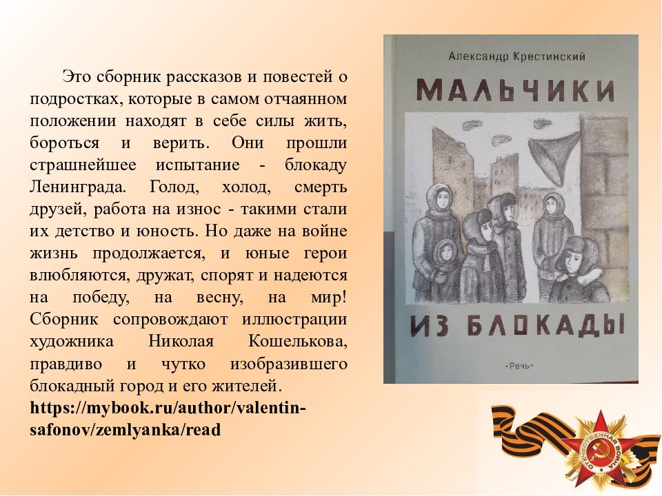 Это сборник рассказов и повестей о подростках, которые в самом отчаянном положении находят в себе силы жить, бороться и верить. Они прошли страшнейшее испытание - блокаду Ленинграда. Голод, холод, смерть друзей, работа на износ - такими стали их детство и юность. Но даже на войне жизнь продолжается, и юные герои влюбляются, дружат, спорят и надеются на победу, на весну, на мир! Сборник сопровождают иллюстрации художника Николая Кошелькова, правдиво и чутко изобразившего блокадный город и его жителей. https://mybook.ru/author/valentin-safonov/zemlyanka/read