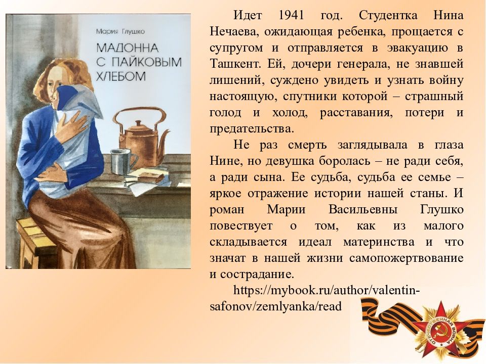 Идет 1941 год. Студентка Нина Нечаева, ожидающая ребенка, прощается с супругом и отправляется в эвакуацию в Ташкент. Ей, дочери генерала, не знавшей лишений, суждено увидеть и узнать войну настоящую, спутники которой – страшный голод и холод, расставания, потери и предательства. Не раз смерть заглядывала в глаза Нине, но девушка боролась – не ради себя, а ради сына. Ее судьба, судьба ее семье – яркое отражение истории нашей станы. И роман Марии Васильевны Глушко повествует о том, как из малого складывается идеал материнства и что значат в нашей жизни самопожертвование и сострадание. https://mybook.ru/author/valentin-safonov/zemlyanka/read