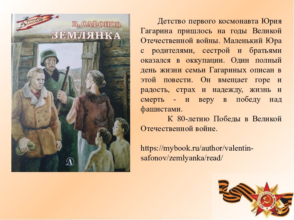 Детство первого космонавта Юрия Гагарина пришлось на годы Великой Отечественной войны. Маленький Юра с родителями, сестрой и братьями оказался в оккупации. Один полный день жизни семьи Гагариных описан в этой повести. Он вмещает горе и радость, страх и надежду, жизнь и смерть - и веру в победу над фашистами. К 80-летию Победы в Великой Отечественной войне. https://mybook.ru/author/valentin-safonov/zemlyanka/read/