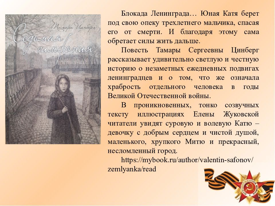 Блокада Ленинграда… Юная Катя берет под свою опеку трехлетнего мальчика, спасая его от смерти. И благодаря этому сама обретает силы жить дальше. Повесть Тамары Сергеевны Цинберг рассказывает удивительно светлую и честную историю о незаметных ежедневных подвигах ленинградцев и о том, что же означала храбрость отдельного человека в годы Великой Отечественной войны. В проникновенных, тонко созвучных тексту иллюстрациях Елены Жуковской читатели увидят суровую и волевую Катю – девочку с добрым сердцем и чистой душой, маленького, хрупкого Митю и прекрасный, несломленный город. https://mybook.ru/author/valentin-safonov/zemlyanka/read