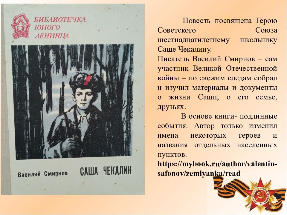 Повесть посвящена Герою Советского Союза шестнадцатилетнему школьнику Саше Чекалину. Писатель Василий Смирнов – сам участник Великой Отечественной войны – по свежим следам собрал и изучил материалы и документы о жизни Саши, о его семье, друзьях. В основе книги- подлинные события. Автор только изменил имена некоторых героев и названия отдельных населенных пунктов. https://mybook.ru/author/valentin-safonov/zemlyanka/read