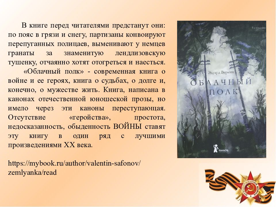 В книге перед читателями предстанут они: по пояс в грязи и снегу, партизаны конвоируют перепуганных полицаев, выменивают у немцев гранаты за знаменитую лендлизовскую тушенку, отчаянно хотят отогреться и наесться. «Облачный полк» - современная книга о войне и ее героях, книга о судьбах, о долге и, конечно, о мужестве жить. Книга, написана в канонах отечественной юношеской прозы, но имело через эти каноны переступающая. Отсутствие «геройства», простота, недосказанность, обыденность ВОЙНЫ ставят эту книгу в один ряд с лучшими произведениями XX века. https://mybook.ru/author/valentin-safonov/zemlyanka/read