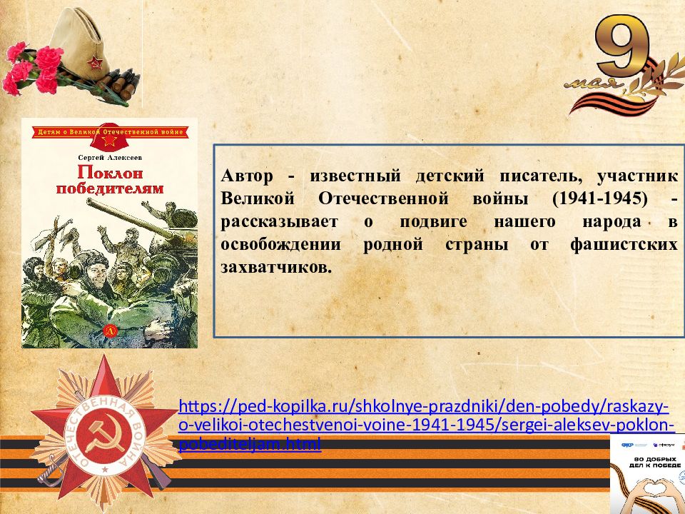 Слайд 5: https://ped-kopilka.ru/shkolnye-prazdniki/den-pobedy/raskazy-o-velikoi-otechestvenoi-voine-1941-1945/sergei-aleksev-poklon-pobediteljam.html