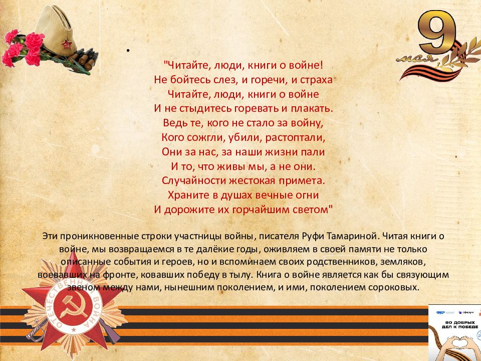 "Читайте, люди, книги о войне! Не бойтесь слез, и горечи, и страха Читайте, люди, книги о войне И не стыдитесь горевать и плакать. Ведь те, кого не стало за войну, Кого сожгли, убили, растоптали, Они за нас, за наши жизни пали И то, что живы мы, а не они. Случайности жестокая примета. Храните в душах вечные огни И дорожите их горчайшим светом" Эти проникновенные строки участницы войны, писателя Руфи Тамариной. Читая книги о войне, мы возвращаемся в те далёкие годы, оживляем в своей памяти не только описанные события и героев, но и вспоминаем своих родственников, земляков, воевавших на фронте, ковавших победу в тылу. Книга о войне является как бы связующим звеном между нами, нынешним поколением, и ими, поколением сороковых.