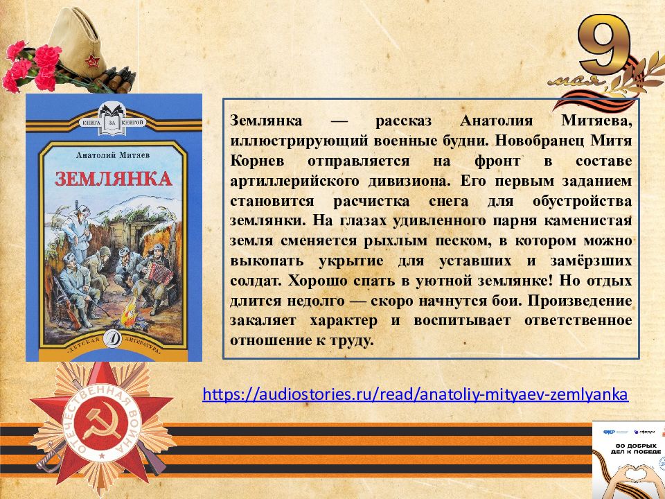 Слайд 2: https://audiostories.ru/read/anatoliy-mityaev-zemlyanka