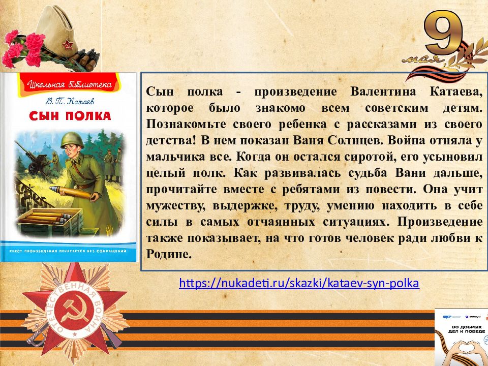 Сын полка - произведение Валентина Катаева, которое было знакомо всем советским детям. Познакомьте своего ребенка с рассказами из своего детства! В нем показан Ваня Солнцев. Война отняла у мальчика все. Когда он остался сиротой, его усыновил целый полк. Как развивалась судьба Вани дальше, прочитайте вместе с ребятами из повести. Она учит мужеству, выдержке, труду, умению находить в себе силы в самых отчаянных ситуациях. Произведение также показывает, на что готов человек ради любви к Родине.