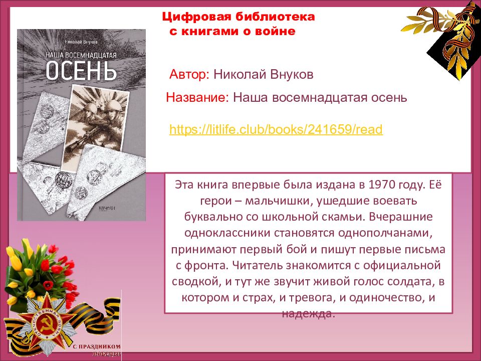 Цифровая библиотека с книгами о войне Автор: Николай Внуков Название: Наша восемнадцатая осень https://litlife.club/books/241659/read Эта книга впервые была издана в 1970 году. Её герои – мальчишки, ушедшие воевать буквально со школьной скамьи. Вчерашние одноклассники становятся однополчанами, принимают первый бой и пишут первые письма с фронта. Читатель знакомится с официальной сводкой, и тут же звучит живой голос солдата, в котором и страх, и тревога, и одиночество, и надежда.