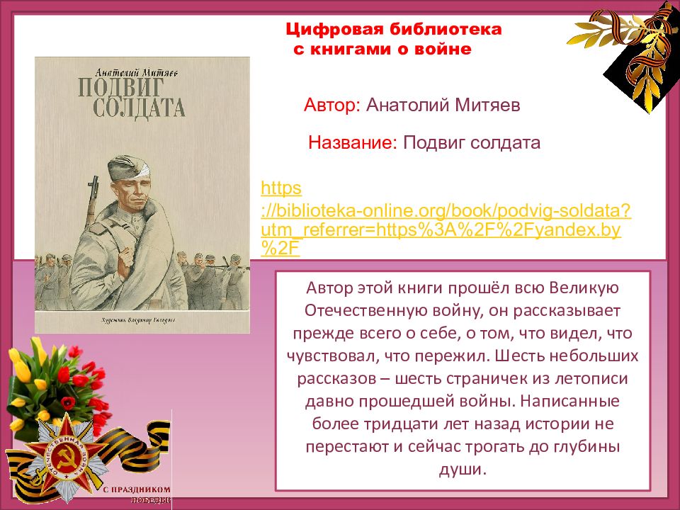 Цифровая библиотека с книгами о войне Автор: Анатолий Митяев Название : Подвиг солдата https ://biblioteka-online.org/book/podvig-soldata?utm_referrer=https%3A%2F%2Fyandex.by%2F Автор этой книги прошёл всю Великую Отечественную войну, он рассказывает прежде всего о себе, о том, что видел, что чувствовал, что пережил. Шесть небольших рассказов – шесть страничек из летописи давно прошедшей войны. Написанные более тридцати лет назад истории не перестают и сейчас трогать до глубины души.