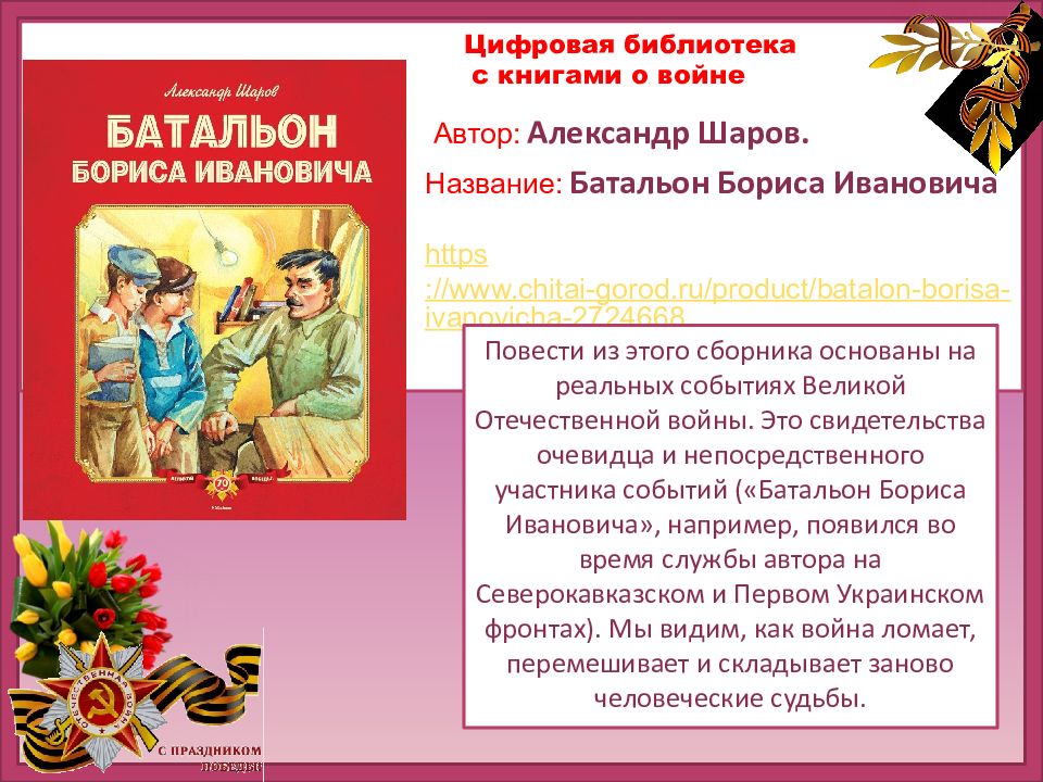 Цифровая библиотека с книгами о войне Автор: Александр Шаров. Название: Батальон Бориса Ивановича https ://www.chitai-gorod.ru/product/batalon-borisa-ivanovicha-2724668 Повести из этого сборника основаны на реальных событиях Великой Отечественной войны. Это свидетельства очевидца и непосредственного участника событий («Батальон Бориса Ивановича», например, появился во время службы автора на Северокавказском и Первом Украинском фронтах). Мы видим, как война ломает, перемешивает и складывает заново человеческие судьбы.