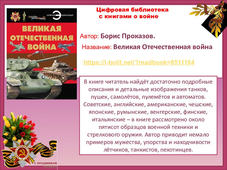 Цифровая библиотека с книгами о войне Автор: Борис Проказов. Название: Великая Отечественная война https:// i-bolit.net/?readbook=8511164 В книге читатель найдёт достаточно подробные описания и детальные изображения танков, пушек, самолётов, пулемётов и автоматов. Советские, английские, американские, чешские, японские, румынские, венгерские, финские, итальянские – в книге рассмотрено около пятисот образцов военной техники и стрелкового оружия. Автор приводит немало примеров мужества, упорства и находчивости лётчиков, танкистов, пехотинцев.