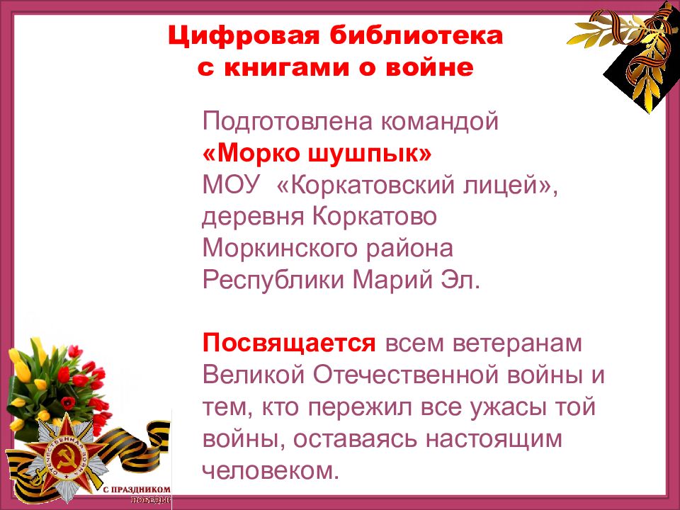 Цифровая библиотека с книгами о войне Подготовлена командой « Морко шушпык » МОУ « Коркатовский лицей», деревня Коркатово Моркинского района Республики Марий Эл. Посвящается всем ветеранам Великой Отечественной войны и тем, кто пережил все ужасы той войны, оставаясь настоящим человеком.