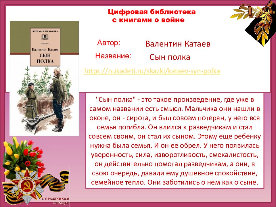 Цифровая библиотека с книгами о войне Валентин Катаев https://nukadeti.ru/skazki/kataev-syn-polka Автор: Название: Сын полка "Сын полка" - это такое произведение, где уже в самом названии есть смысл. Мальчика они нашли в окопе, он - сирота, и был совсем потерян, у него вся семья погибла. Он влился к разведчикам и стал совсем своим, он стал их сыном. Этому еще ребенку нужна была семья. И он ее обрел. У него появилась уверенность, сила, изворотливость, смекалистость, он действительно помогал разведчикам, а они, в свою очередь, давали ему душевное спокойствие, семейное тепло. Они заботились о нем как о сыне.