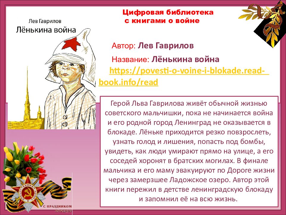 Цифровая библиотека с книгами о войне Автор: Лев Гаврилов Название: Лёнькина война https:// povesti-o-voine-i-blokade.read- book.info/read Герой Льва Гаврилова живёт обычной жизнью советского мальчишки, пока не начинается война и его родной город Ленинград не оказывается в блокаде. Лёньке приходится резко повзрослеть, узнать голод и лишения, попасть под бомбы, увидеть, как люди умирают прямо на улице, а его соседей хоронят в братских могилах. В финале мальчика и его маму эвакуируют по Дороге жизни через замерзшее Ладожское озеро. Автор этой книги пережил в детстве ленинградскую блокаду и запомнил её на всю жизнь.