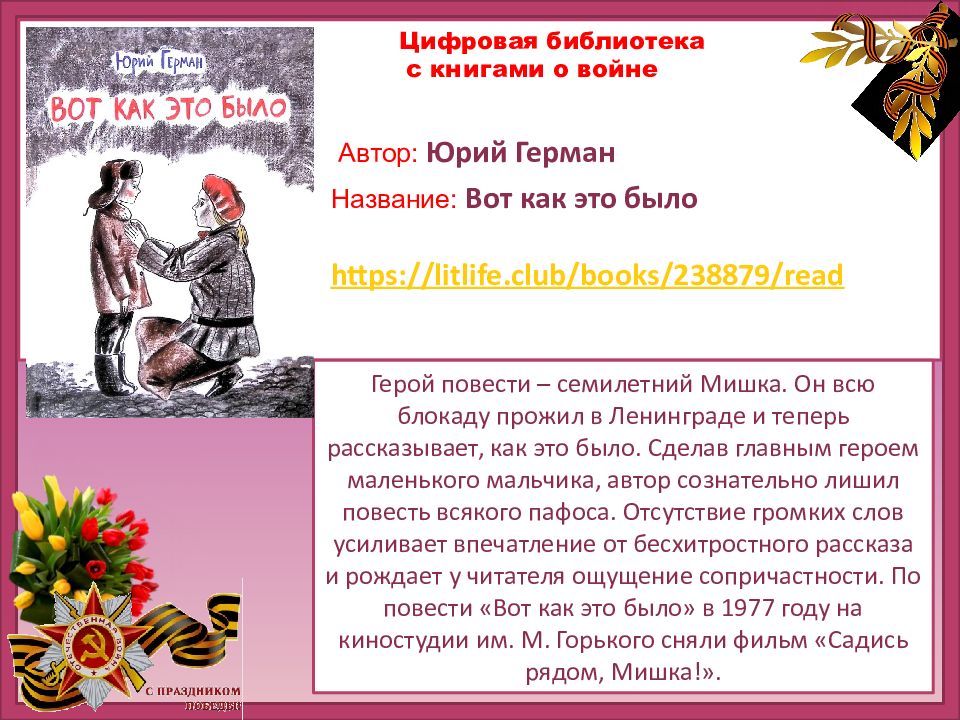 Цифровая библиотека с книгами о войне Автор: Юрий Герман Название: Вот как это было https ://litlife.club/books/238879/read Герой повести – семилетний Мишка. Он всю блокаду прожил в Ленинграде и теперь рассказывает, как это было. Сделав главным героем маленького мальчика, автор сознательно лишил повесть всякого пафоса. Отсутствие громких слов усиливает впечатление от бесхитростного рассказа и рождает у читателя ощущение сопричастности. По повести «Вот как это было» в 1977 году на киностудии им. М. Горького сняли фильм «Садись рядом, Мишка!».