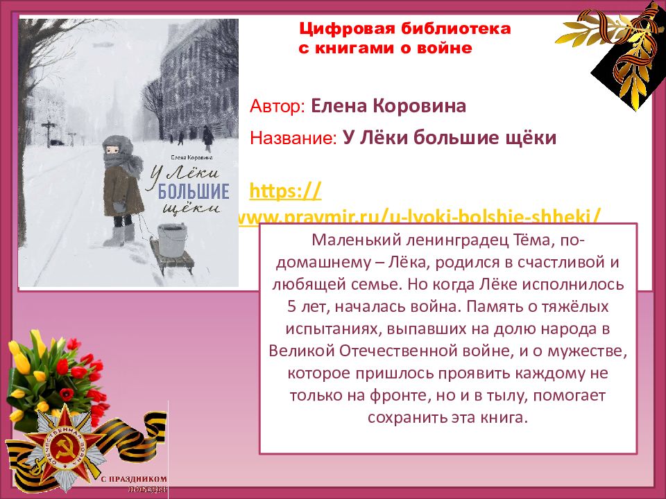 Цифровая библиотека с книгами о войне Автор: Елена Коровина Название: У Лёки большие щёки https :// www.pravmir.ru/u-lyoki-bolshie-shheki / Маленький ленинградец Тёма, по-домашнему – Лёка, родился в счастливой и любящей семье. Но когда Лёке исполнилось 5 лет, началась война. Память о тяжёлых испытаниях, выпавших на долю народа в Великой Отечественной войне, и о мужестве, которое пришлось проявить каждому не только на фронте, но и в тылу, помогает сохранить эта книга.