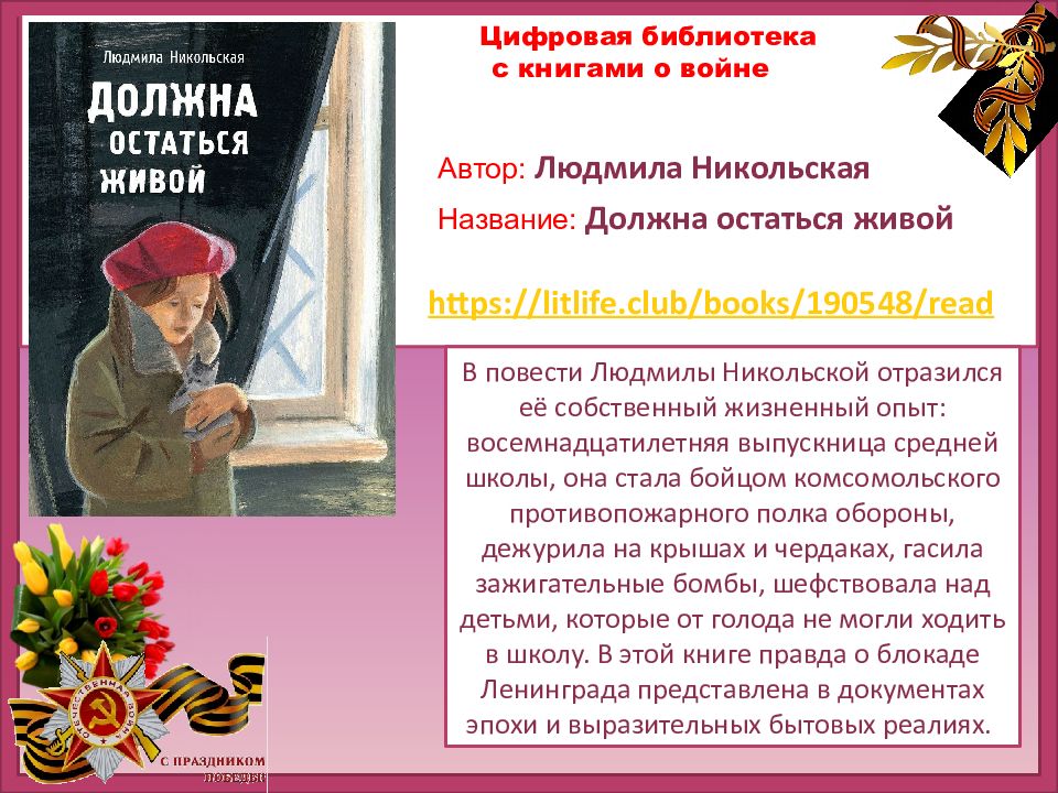 Цифровая библиотека с книгами о войне Автор: Людмила Никольская Название: Должна остаться живой https ://litlife.club/books/190548/read В повести Людмилы Никольской отразился её собственный жизненный опыт: восемнадцатилетняя выпускница средней школы, она стала бойцом комсомольского противопожарного полка обороны, дежурила на крышах и чердаках, гасила зажигательные бомбы, шефствовала над детьми, которые от голода не могли ходить в школу. В этой книге правда о блокаде Ленинграда представлена в документах эпохи и выразительных бытовых реалиях.