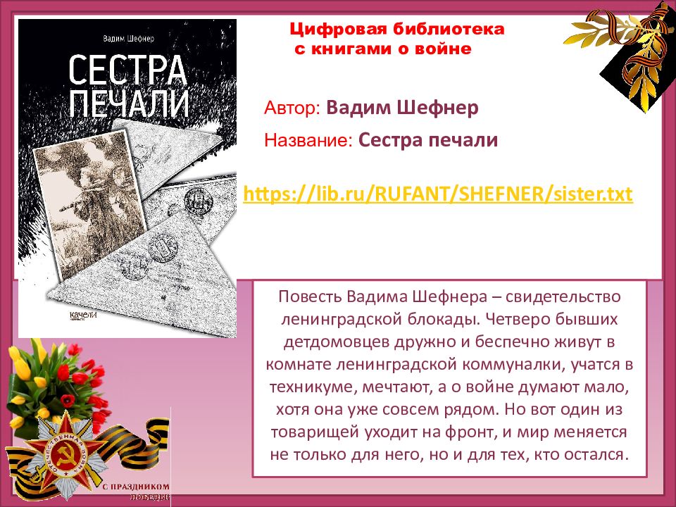 Цифровая библиотека с книгами о войне Автор: Вадим Шефнер Название: Сестра печали https ://lib.ru/RUFANT/SHEFNER/sister.txt Повесть Вадима Шефнера – свидетельство ленинградской блокады. Четверо бывших детдомовцев дружно и беспечно живут в комнате ленинградской коммуналки, учатся в техникуме, мечтают, а о войне думают мало, хотя она уже совсем рядом. Но вот один из товарищей уходит на фронт, и мир меняется не только для него, но и для тех, кто остался.