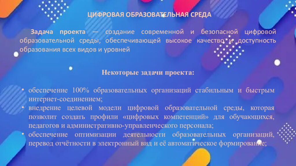 ЦИФРОВАЯ ОБРАЗОВАТЕЛЬНАЯ СРЕДА Задача проекта — создание современной и безопасной цифровой образовательной среды, обеспечивающей высокое качество и доступность образования всех видов и уровней Некоторые задачи проекта: обеспечение 100% образовательных организаций стабильным и быстрым интернет-соединением; внедрение целевой модели цифровой образовательной среды, которая позволит создать профили «цифровых компетенций» для обучающихся, педагогов и административно-управленческого персонала; обеспечение оптимизации деятельности образовательных организаций, перевод отчётности в электронный вид и её автоматическое формирование;