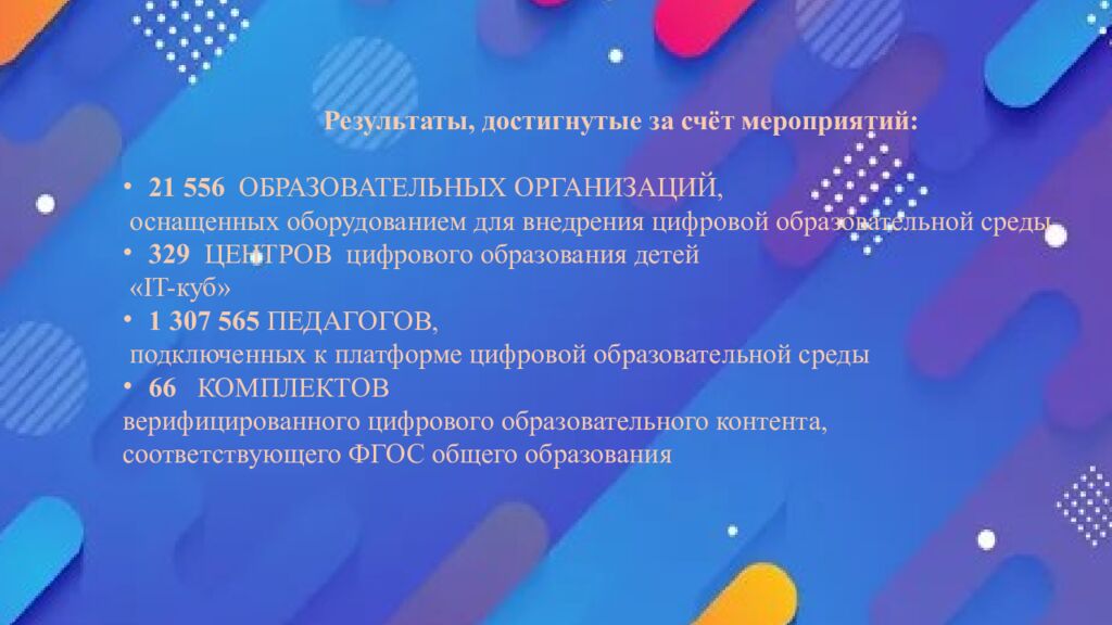 Результаты, достигнутые за счёт мероприятий: 21 556 образовательных организаций, оснащенных оборудованием для внедрения цифровой образовательной среды 329 центров цифрового образования детей «IT-куб» 1 307 565 педагогов, подключенных к платформе цифровой образовательной среды 66 комплектов верифицированного цифрового образовательного контента, соответствующего ФГОС общего образования