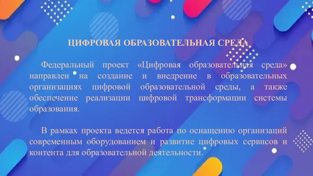 ЦИФРОВАЯ ОБРАЗОВАТЕЛЬНАЯ СРЕДА Федеральный проект «Цифровая образовательная среда» направлен на создание и внедрение в образовательных организациях цифровой образовательной среды, а также обеспечение реализации цифровой трансформации системы образования. В рамках проекта ведется работа по оснащению организаций современным оборудованием и развитие цифровых сервисов и контента для образовательной деятельности.