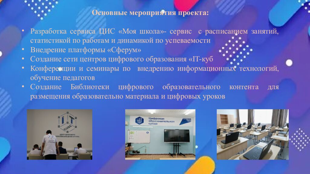 Основные мероприятия проекта Основные мероприятия проекта: Разработка сервиса ЦИС «Моя школа»- сервис с расписанием занятий, статистикой по работам и динамикой по успеваемости Внедрение платформы « Сферум » Создание сети центров цифрового образования « IT- куб Конференции и семинары по внедрению информационных технологий, обучение педагогов Создание Библиотеки цифрового образовательного контента для размещения образовательно материала и цифровых уроков