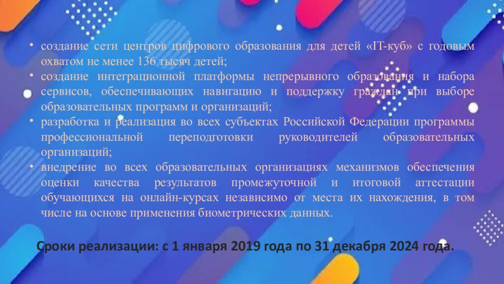 создание сети центров цифрового образования для детей «IT-куб» с годовым охватом не менее 136 тысяч детей; создание интеграционной платформы непрерывного образования и набора сервисов, обеспечивающих навигацию и поддержку граждан при выборе образовательных программ и организаций; разработка и реализация во всех субъектах Российской Федерации программы профессиональной переподготовки руководителей образовательных организаций; внедрение во всех образовательных организациях механизмов обеспечения оценки качества результатов промежуточной и итоговой аттестации обучающихся на онлайн-курсах независимо от места их нахождения, в том числе на основе применения биометрических данных. Сроки реализации: с 1 января 2019 года по 31 декабря 2024 года.