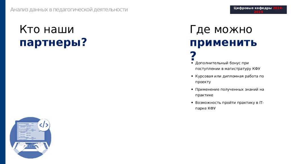 Анализ данных в педагогической деятельности Цифровые кафедры 2024-2025 Где можно применить ? Дополнительный бонус при поступлении в магистратуру КФУ Курсовая или дипломная работа по проекту Применение полученных знаний на практике Возможность пройти практику в IT- парке КФУ Кто наши партнеры?