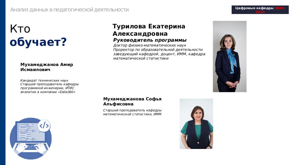 Цифровые кафедры 2024-2025 Кто обучает? Турилова Екатерина Александровна Руководитель программы Доктор физико-математических наук Проректор по образовательной деятельности заведующий кафедрой, доцент, ИММ, кафедра математической статистики Кандидат технических наук Старший преподаватель кафедры программной инженерии, ИТИС аналитик в компании « Data360 » Мухамеджанов Амир Исмаилович Анализ данных в педагогической деятельности Мухамеджанова Софья Альфисовна Старший преподаватель кафедры математической статистики, ИММ