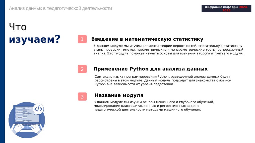 Цифровые кафедры 2024-2025 Что изучаем ? 1 3 2 Введение в математическую статистику В данном модуле мы изучим элементы теории вероятностей, описательную статистику, этапы проверки гипотез, параметрические и непараметрические тесты, регрессионный анализ. Этот модуль поможет изучить основы для изучения второго и третьего модуля. Название модуля В данном модуле мы изучим основы машинного и глубокого обучений, моделирование классификационных и регрессионных задач в педагогической деятельности методами машинного обучения. Применение Python для анализа данных Синтаксис языка программирования Python, разведочный анализ данных будут рассмотрены в этом модуле. Данный модуль подходит для знакомства с языком Python вне зависимости от уровня подготовки. Анализ данных в педагогической деятельности