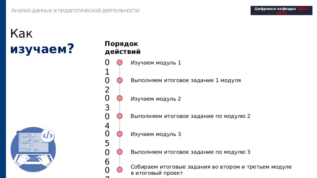 Цифровые кафедры 2024-2025 Как изучаем ? Порядок действий Изучаем модуль 1 Выполняем итоговое задание 1 модуля Изучаем модуль 2 Выполняем итоговое задание по модулю 2 Изучаем модуль 3 Выполняем итоговое задание по модулю 3 Собираем итоговые задания во втором и третьем модуле в итоговый проект 01 02 03 04 05 06 07 Анализ данных в педагогической деятельности