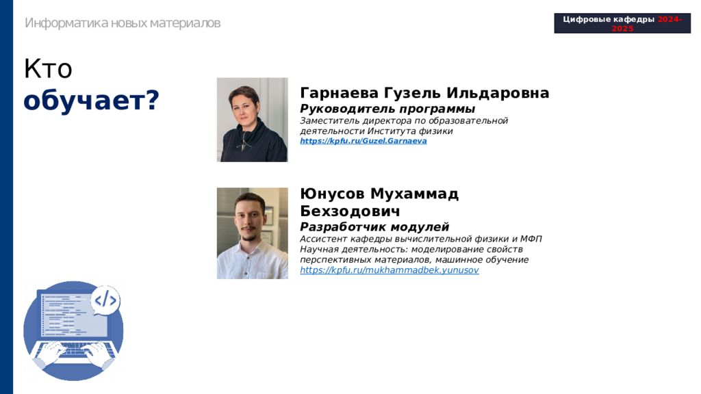 Цифровые кафедры 2024-2025 Кто обучает? Гарнаева Гузель Ильдаровна Руководитель программы Заместитель директора по образовательной деятельности Института физики https://kpfu.ru/Guzel.Garnaeva Информатика новых материалов Юнусов Мухаммад Бехзодович Разработчик модулей Ассистент кафедры вычислительной физики и МФП Научная деятельность: моделирование свойств перспективных материалов, машинное обучение https://kpfu.ru/mukhammadbek.yunusov