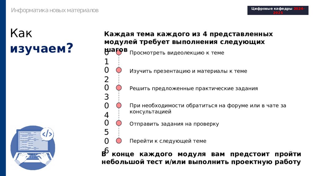 Информатика новых материалов Цифровые кафедры 2024-2025 Как изучаем ? Каждая тема каждого из 4 представленных модулей требует выполнения следующих шагов Изучить презентацию и материалы к теме Решить предложенные практические задания При необходимости обратиться на форуме или в чате за консультацией Отправить задания на проверку 01 02 03 04 05 06 Просмотреть видеолекцию к теме Перейти к следующей теме В конце каждого модуля вам предстоит пройти небольшой тест и/или выполнить проектную работу