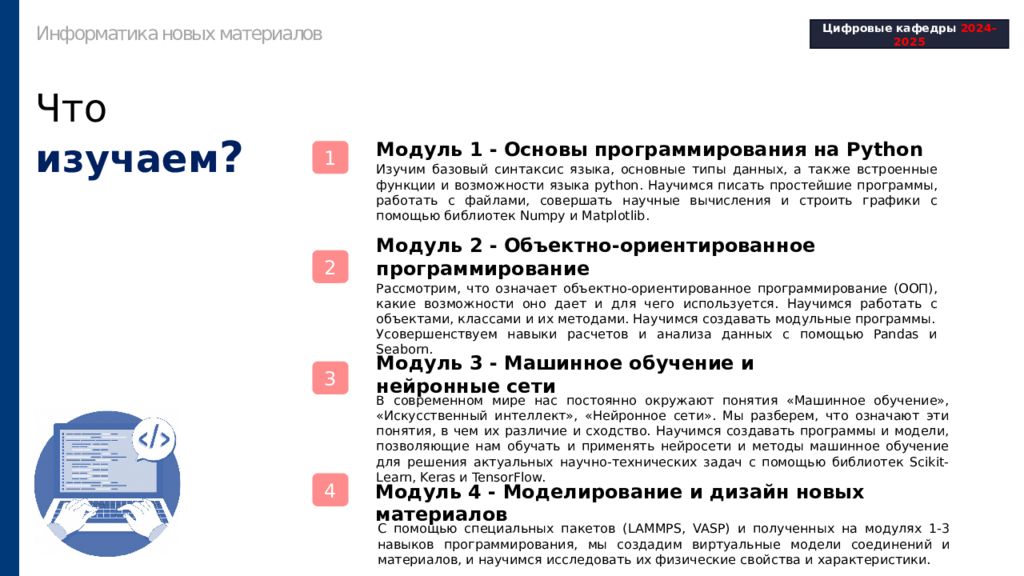 Информатика новых материалов Цифровые кафедры 2024-2025 Что изучаем ? 1 2 3 4 Модуль 1 - Основы программирования на Python Изучим базовый синтаксис языка, основные типы данных, а также встроенные функции и возможности языка python. Научимся писать простейшие программы, работать с файлами, совершать научные вычисления и строить графики с помощью библиотек Numpy и Matplotlib. Модуль 2 - Объектно-ориентированное программирование Рассмотрим, что означает объектно-ориентированное программирование (ООП), какие возможности оно дает и для чего используется. Научимся работать с объектами, классами и их методами. Научимся создавать модульные программы. Усовершенствуем навыки расчетов и анализа данных с помощью Pandas и Seaborn. Модуль 3 - Машинное обучение и нейронные сети В современном мире нас постоянно окружают понятия «Машинное обучение», «Искусственный интеллект», «Нейронное сети». Мы разберем, что означают эти понятия, в чем их различие и сходство. Научимся создавать программы и модели, позволяющие нам обучать и применять нейросети и методы машинное обучение для решения актуальных научно-технических задач с помощью библиотек Scikit-Learn, Keras и TensorFlow. Модуль 4 - Моделирование и дизайн новых материалов С помощью специальных пакетов ( LAMMPS, VASP ) и полученных на модулях 1-3 навыков программирования, мы создадим виртуальные модели соединений и материалов, и научимся исследовать их физические свойства и характеристики.