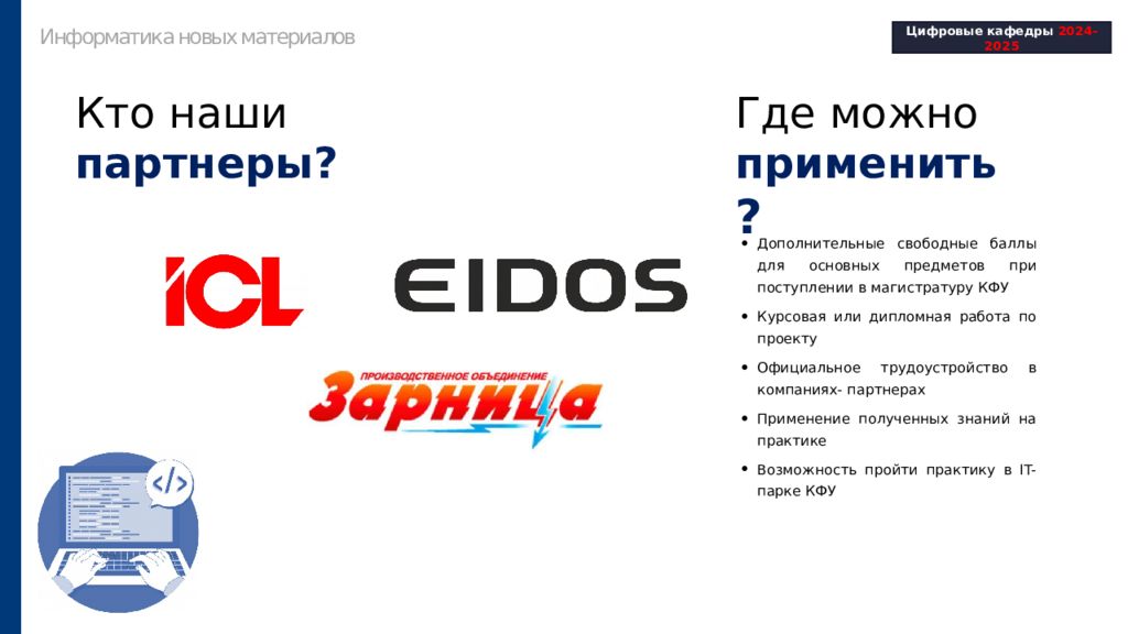 Цифровые кафедры 2024-2025 Где можно применить ? Дополнительные свободные баллы для основных предметов при поступлении в магистратуру КФУ Курсовая или дипломная работа по проекту Официальное трудоустройство в компаниях- партнерах Применение полученных знаний на практике Возможность пройти практику в IT- парке КФУ Кто наши партнеры? Информатика новых материалов