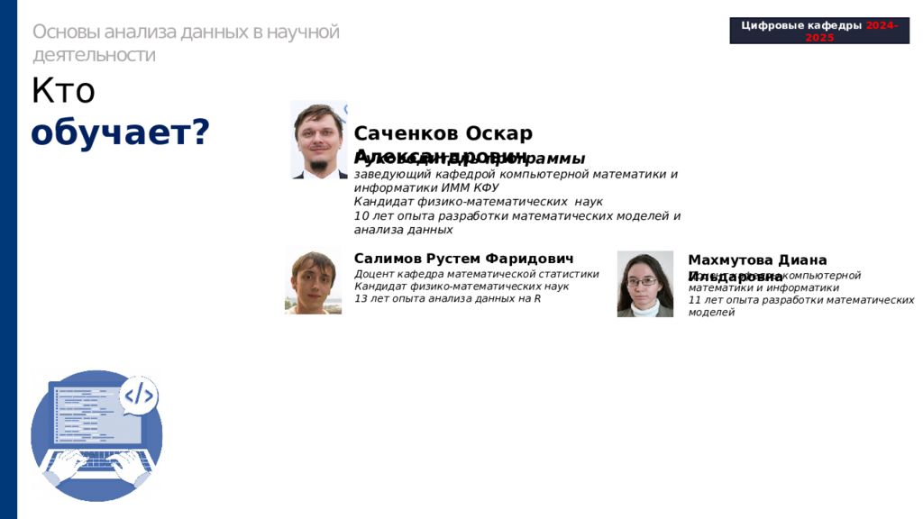 Основы анализа данных в научной деятельности Цифровые кафедры 2024-2025 Кто обучает? Саченков Оскар Александрович Руководитель программы заведующий кафедрой компьютерной математики и информатики ИММ КФУ Кандидат физико-математических наук 10 лет опыта разработки математических моделей и анализа данных Доцент кафедра математической статистики Кандидат физико-математических наук 13 лет опыта анализа данных на R Салимов Рустем Фаридович Доцент кафедры компьютерной математики и информатики 11 лет опыта разработки математических моделей Махмутова Диана Ильдаровна